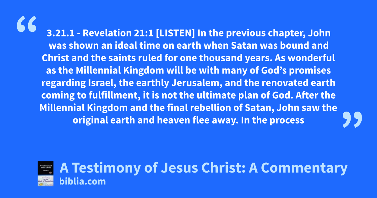 3.21.1 - Revelation 21:1 [LISTEN] In the previous chapter, John was shown an ideal time on earth when Satan was bound and Christ and the saints ruled for one thousand years. As wonderful as the Millennial Kingdom will be with many of God’s promises regarding Israel, the earthly Jerusalem, and the renovated earth coming to fulfillment, it is not the ultimate plan of God. After the Millennial Kingdom and the final rebellion of Satan, John saw the original earth and heaven flee away. In the process