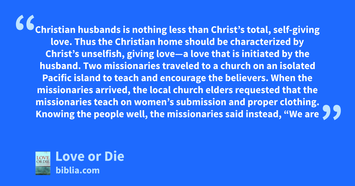 Christian husbands is nothing less than Christ’s total, self-giving love. Thus the Christian home should be characterized by Christ’s unselfish, giving love—a love that is initiated by the husband. Two missionaries traveled to a church on an isolated Pacific island to teach and encourage the believers. When the missionaries arrived, the local church elders requested that the missionaries teach on women’s submission and proper clothing. Knowing the people well, the missionaries said instead, “We are