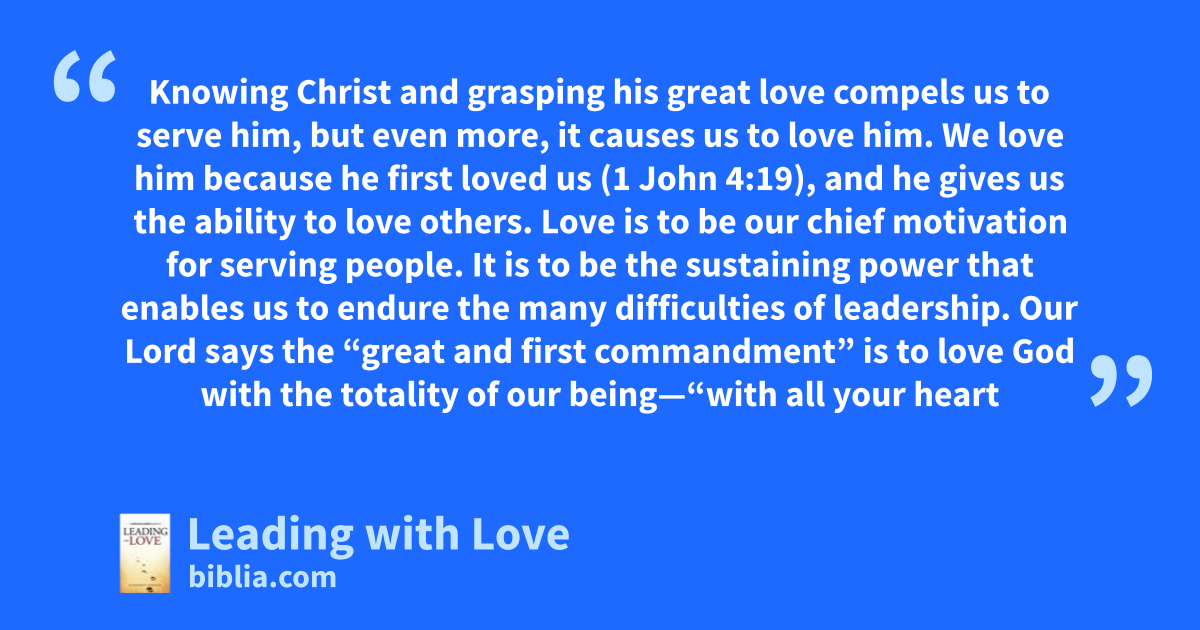 Knowing Christ and grasping his great love compels us to serve him, but even more, it causes us to love him. We love him because he first loved us (1 John 4:19), and he gives us the ability to love others. Love is to be our chief motivation for serving people. It is to be the sustaining power that enables us to endure the many difficulties of leadership. Our Lord says the “great and first commandment” is to love God with the totality of our being—“with all your heart
