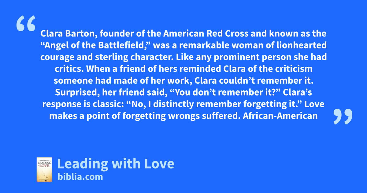 Clara Barton, founder of the American Red Cross and known as the “Angel of the Battlefield,” was a remarkable woman of lionhearted courage and sterling character. Like any prominent person she had critics. When a friend of hers reminded Clara of the criticism someone had made of her work, Clara couldn’t remember it. Surprised, her friend said, “You don’t remember it?” Clara’s response is classic: “No, I distinctly remember forgetting it.” Love makes a point of forgetting wrongs suffered. African-American