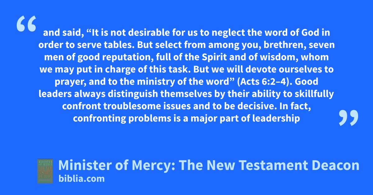 and said, “It is not desirable for us to neglect the word of God in order to serve tables. But select from among you, brethren, seven men of good reputation, full of the Spirit and of wisdom, whom we may put in charge of this task. But we will devote ourselves to prayer, and to the ministry of the word” (Acts 6:2–4). Good leaders always distinguish themselves by their ability to skillfully confront troublesome issues and to be decisive. In fact, confronting problems is a major part of leadership