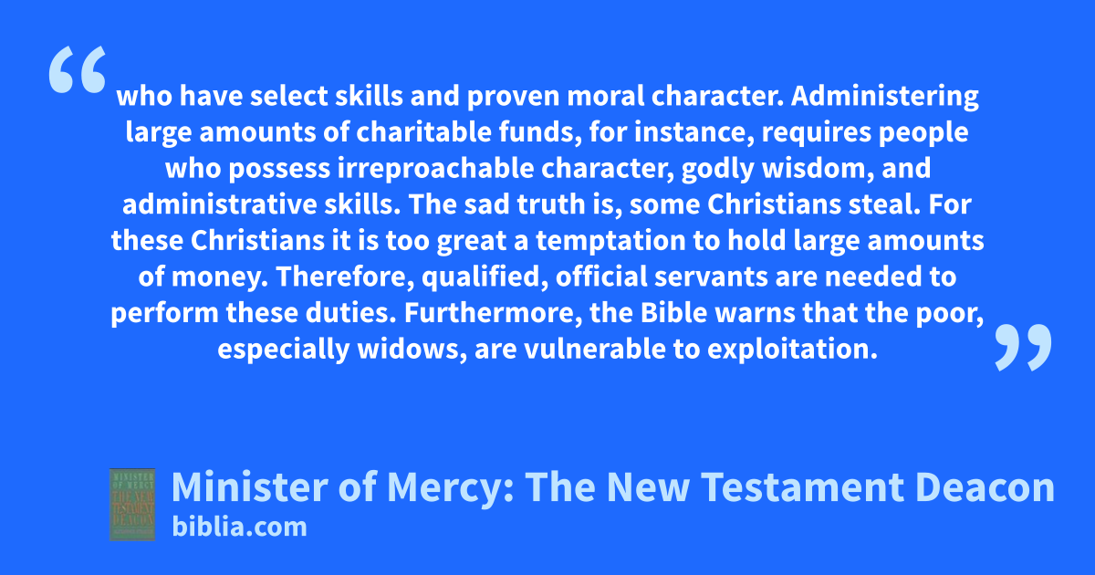 who have select skills and proven moral character. Administering large amounts of charitable funds, for instance, requires people who possess irreproachable character, godly wisdom, and administrative skills. The sad truth is, some Christians steal. For these Christians it is too great a temptation to hold large amounts of money. Therefore, qualified, official servants are needed to perform these duties. Furthermore, the Bible warns that the poor, especially widows, are vulnerable to exploitation.