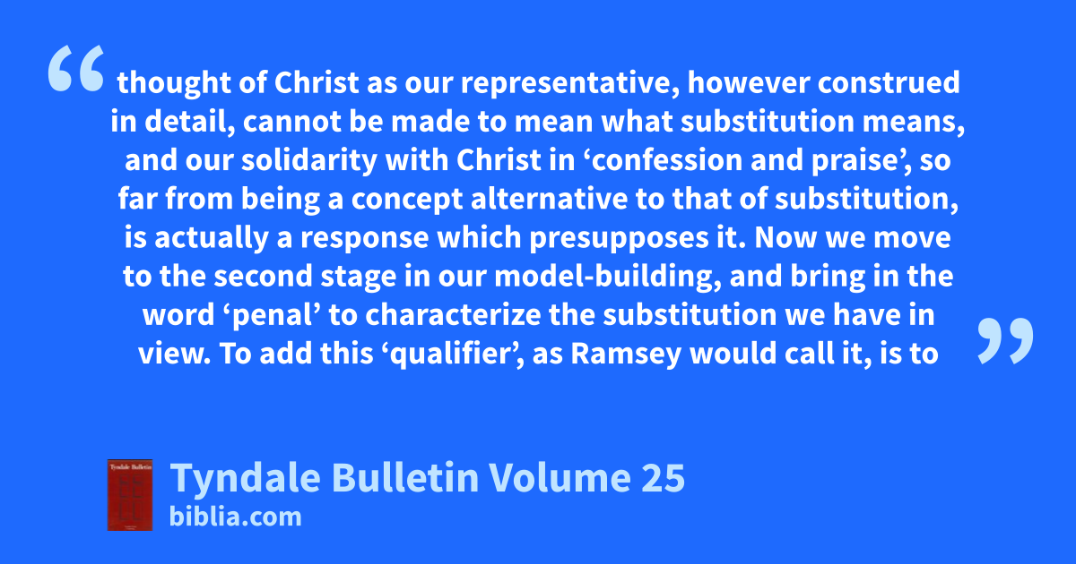 thought of Christ as our representative, however construed in detail, cannot be made to mean what substitution means, and our solidarity with Christ in ‘confession and praise’, so far from being a concept alternative to that of substitution, is actually a response which presupposes it. Now we move to the second stage in our model-building, and bring in the word ‘penal’ to characterize the substitution we have in view. To add this ‘qualifier’, as Ramsey would call it, is to