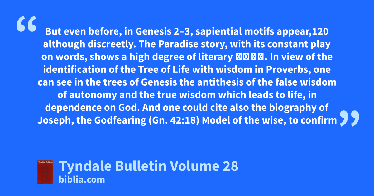 But even before, in Genesis 2–3, sapiential motifs appear,120 although discreetly. The Paradise story, with its constant play on words, shows a high degree of literary חכמה. In view of the identification of the Tree of Life with wisdom in Proverbs, one can see in the trees of Genesis the antithesis of the false wisdom of autonomy and the true wisdom which leads to life, in dependence on God. And one could cite also the biography of Joseph, the Godfearing (Gn. 42:18) Model of the wise, to confirm