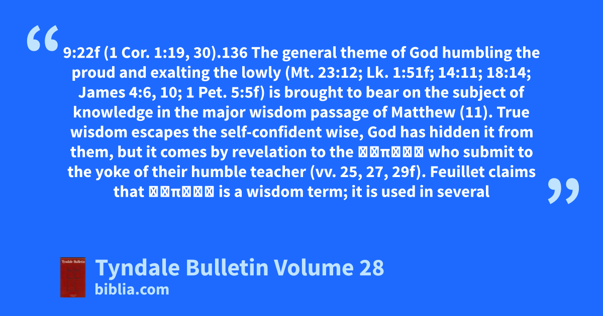 9:22f (1 Cor. 1:19, 30).136 The general theme of God humbling the proud and exalting the lowly (Mt. 23:12; Lk. 1:51f; 14:11; 18:14; James 4:6, 10; 1 Pet. 5:5f) is brought to bear on the subject of knowledge in the major wisdom passage of Matthew (11). True wisdom escapes the self-confident wise, God has hidden it from them, but it comes by revelation to the νήπιοι who submit to the yoke of their humble teacher (vv. 25, 27, 29f). Feuillet claims that νήπιος is a wisdom term; it is used in several