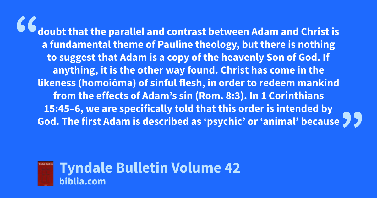 doubt that the parallel and contrast between Adam and Christ is a fundamental theme of Pauline theology, but there is nothing to suggest that Adam is a copy of the heavenly Son of God. If anything, it is the other way found. Christ has come in the likeness (homoiôma) of sinful flesh, in order to redeem mankind from the effects of Adam’s sin (Rom. 8:3). In 1 Corinthians 15:45–6, we are specifically told that this order is intended by God. The first Adam is described as ‘psychic’ or ‘animal’ because