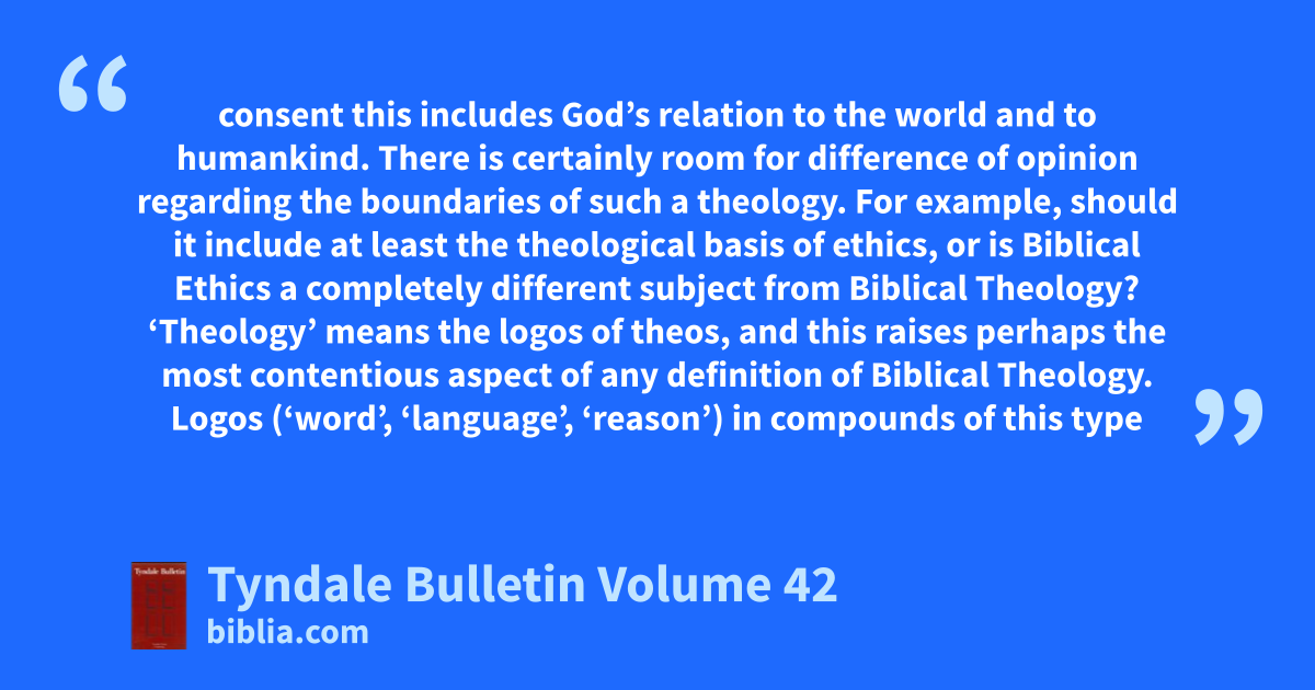 consent this includes God’s relation to the world and to humankind. There is certainly room for difference of opinion regarding the boundaries of such a theology. For example, should it include at least the theological basis of ethics, or is Biblical Ethics a completely different subject from Biblical Theology? ‘Theology’ means the logos of theos, and this raises perhaps the most contentious aspect of any definition of Biblical Theology. Logos (‘word’, ‘language’, ‘reason’) in compounds of this type