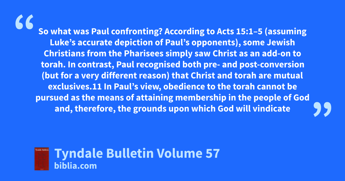 So what was Paul confronting? According to Acts 15:1–5 (assuming Luke’s accurate depiction of Paul’s opponents), some Jewish Christians from the Pharisees simply saw Christ as an add-on to torah. In contrast, Paul recognised both pre- and post-conversion (but for a very different reason) that Christ and torah are mutual exclusives.11 In Paul’s view, obedience to the torah cannot be pursued as the means of attaining membership in the people of God and, therefore, the grounds upon which God will vindicate