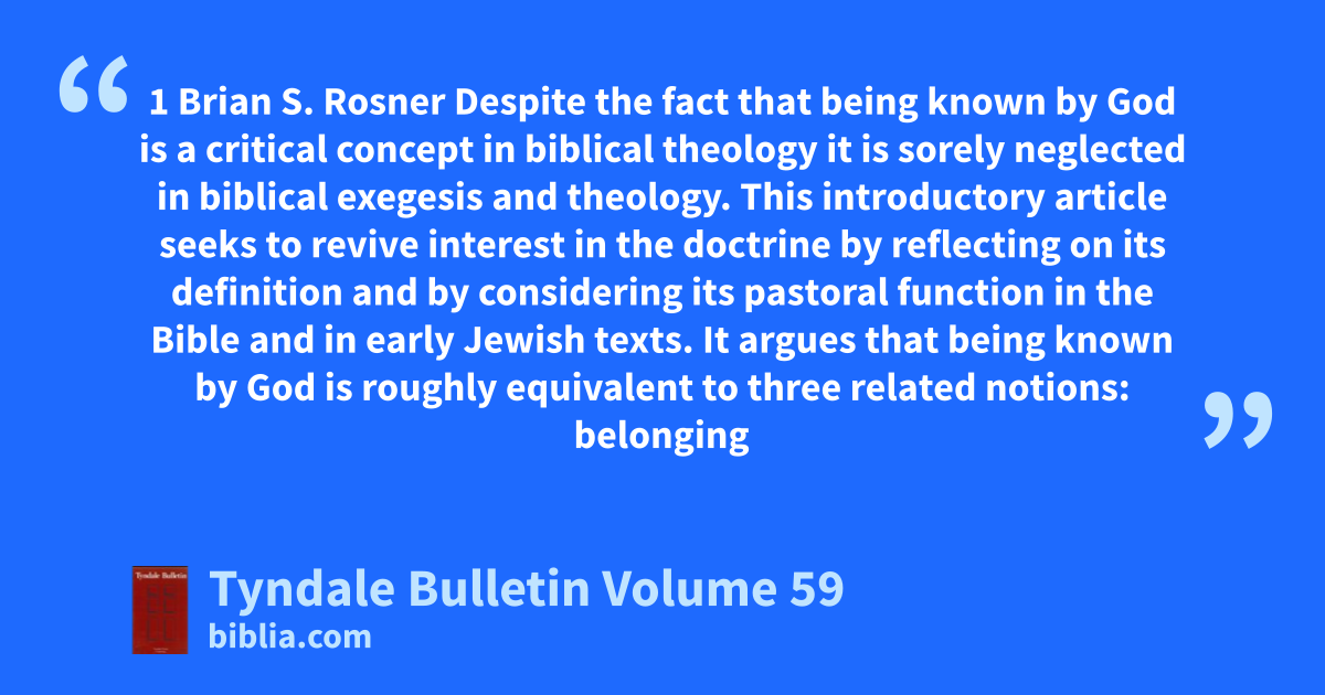 1 Brian S. Rosner Despite the fact that being known by God is a critical concept in biblical theology it is sorely neglected in biblical exegesis and theology. This introductory article seeks to revive interest in the doctrine by reflecting on its definition and by considering its pastoral function in the Bible and in early Jewish texts. It argues that being known by God is roughly equivalent to three related notions: belonging