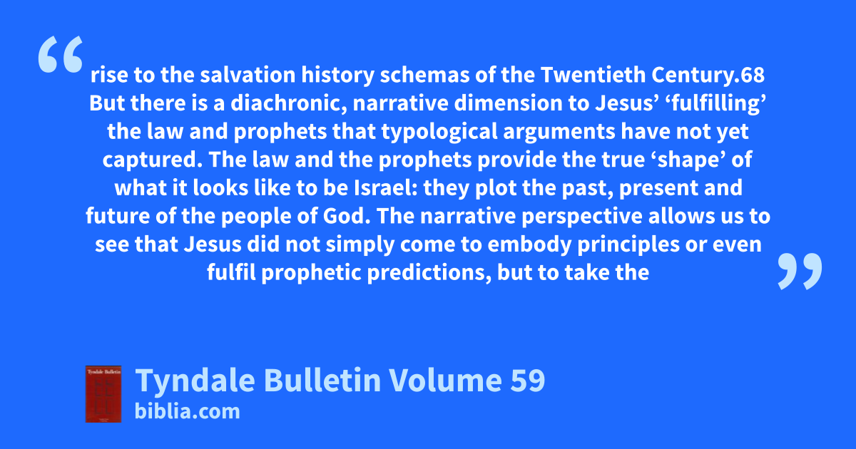 rise to the salvation history schemas of the Twentieth Century.68 But there is a diachronic, narrative dimension to Jesus’ ‘fulfilling’ the law and prophets that typological arguments have not yet captured. The law and the prophets provide the true ‘shape’ of what it looks like to be Israel: they plot the past, present and future of the people of God. The narrative perspective allows us to see that Jesus did not simply come to embody principles or even fulfil prophetic predictions, but to take the