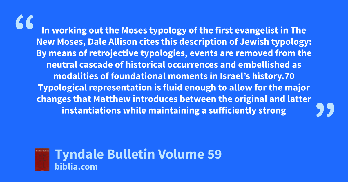In working out the Moses typology of the first evangelist in The New Moses, Dale Allison cites this description of Jewish typology: By means of retrojective typologies, events are removed from the neutral cascade of historical occurrences and embellished as modalities of foundational moments in Israel’s history.70 Typological representation is fluid enough to allow for the major changes that Matthew introduces between the original and latter instantiations while maintaining a sufficiently strong