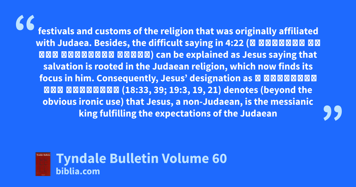 festivals and customs of the religion that was originally affiliated with Judaea. Besides, the difficult saying in 4:22 (ἡ σωτηρία ἐκ τῶν Ἰουδαίων ἐστίν) can be explained as Jesus saying that salvation is rooted in the Judaean religion, which now finds its focus in him. Consequently, Jesus’ designation as ὁ βασιλεὺς τῶν Ἰουδαίων (18:33, 39; 19:3, 19, 21) denotes (beyond the obvious ironic use) that Jesus, a non-Judaean, is the messianic king fulfilling the expectations of the Judaean