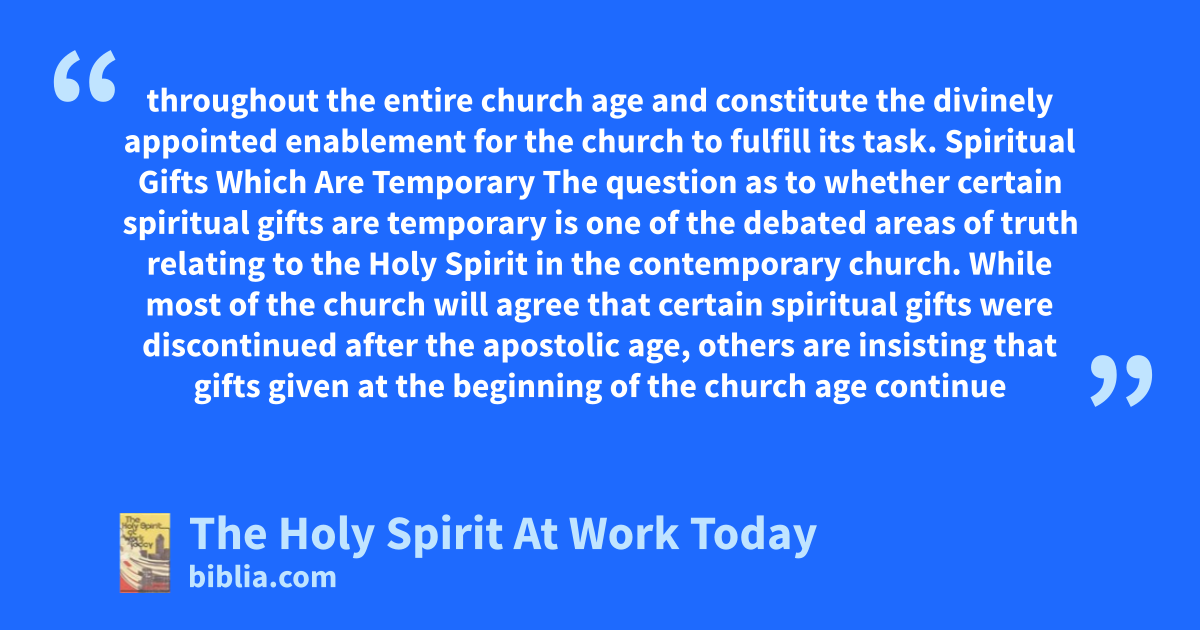 throughout the entire church age and constitute the divinely appointed enablement for the church to fulfill its task. Spiritual Gifts Which Are Temporary The question as to whether certain spiritual gifts are temporary is one of the debated areas of truth relating to the Holy Spirit in the contemporary church. While most of the church will agree that certain spiritual gifts were discontinued after the apostolic age, others are insisting that gifts given at the beginning of the church age continue