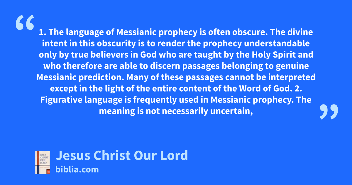 1. The language of Messianic prophecy is often obscure. The divine intent in this obscurity is to render the prophecy understandable only by true believers in God who are taught by the Holy Spirit and who therefore are able to discern passages belonging to genuine Messianic prediction. Many of these passages cannot be interpreted except in the light of the entire content of the Word of God. 2. Figurative language is frequently used in Messianic prophecy. The meaning is not necessarily uncertain,