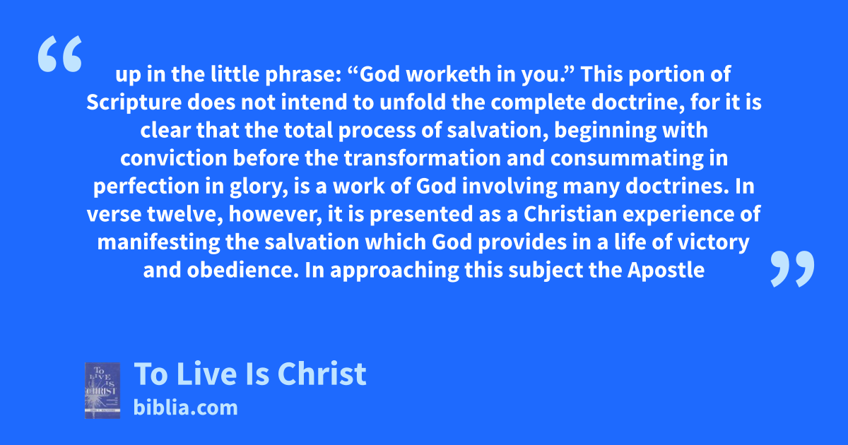 up in the little phrase: “God worketh in you.” This portion of Scripture does not intend to unfold the complete doctrine, for it is clear that the total process of salvation, beginning with conviction before the transformation and consummating in perfection in glory, is a work of God involving many doctrines. In verse twelve, however, it is presented as a Christian experience of manifesting the salvation which God provides in a life of victory and obedience. In approaching this subject the Apostle