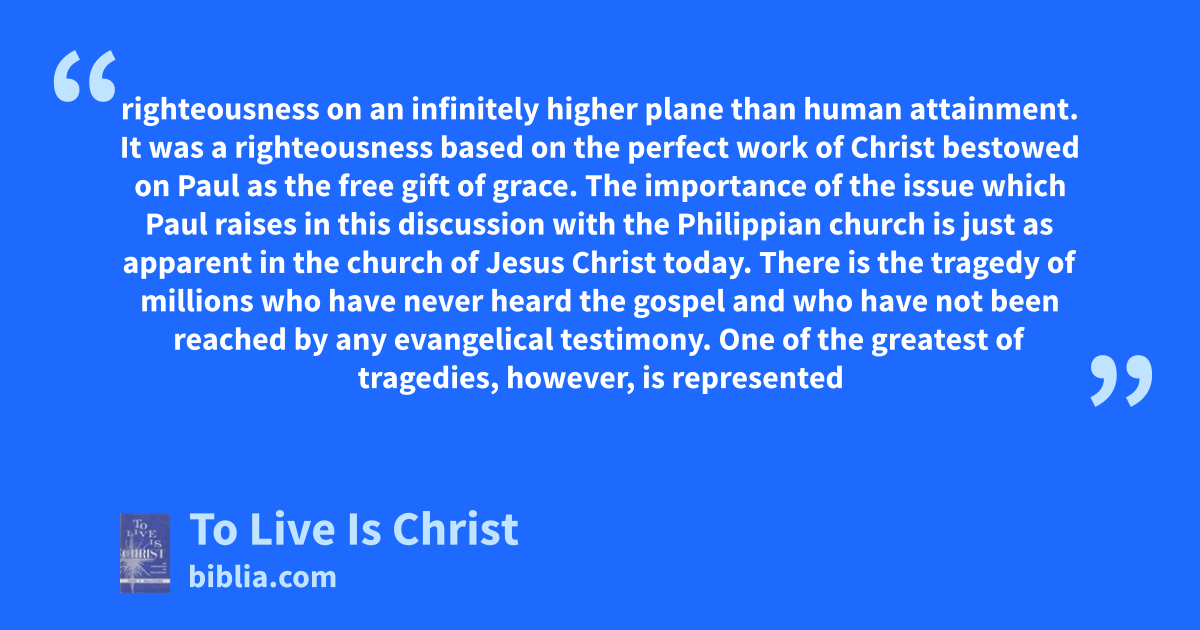 righteousness on an infinitely higher plane than human attainment. It was a righteousness based on the perfect work of Christ bestowed on Paul as the free gift of grace. The importance of the issue which Paul raises in this discussion with the Philippian church is just as apparent in the church of Jesus Christ today. There is the tragedy of millions who have never heard the gospel and who have not been reached by any evangelical testimony. One of the greatest of tragedies, however, is represented