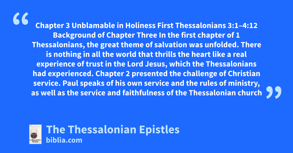 Chapter 3 Unblamable in Holiness First Thessalonians 3:1–4:12 Background of Chapter Three In the first chapter of 1 Thessalonians, the great theme of salvation was unfolded. There is nothing in all the world that thrills the heart like a real experience of trust in the Lord Jesus, which the Thessalonians had experienced. Chapter 2 presented the challenge of Christian service. Paul speaks of his own service and the rules of ministry, as well as the service and faithfulness of the Thessalonian church