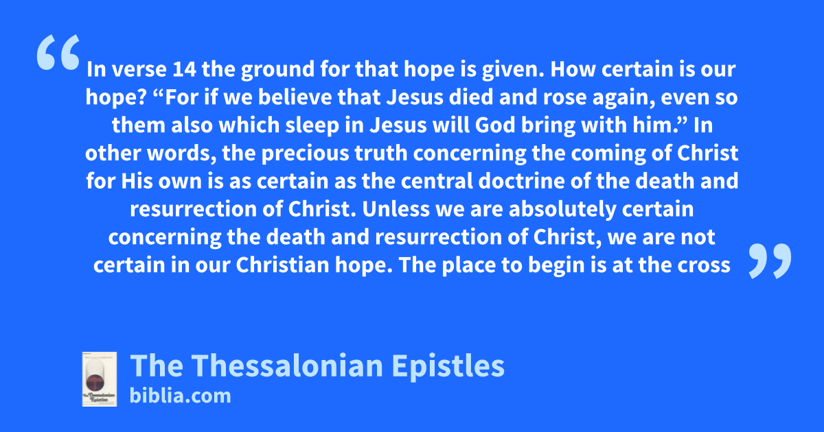 In verse 14 the ground for that hope is given. How certain is our hope? “For if we believe that Jesus died and rose again, even so them also which sleep in Jesus will God bring with him.” In other words, the precious truth concerning the coming of Christ for His own is as certain as the central doctrine of the death and resurrection of Christ. Unless we are absolutely certain concerning the death and resurrection of Christ, we are not certain in our Christian hope. The place to begin is at the cross