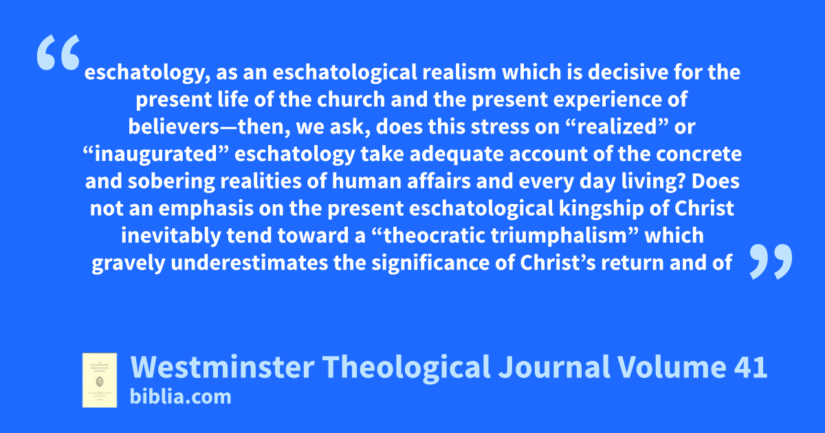 eschatology, as an eschatological realism which is decisive for the present life of the church and the present experience of believers—then, we ask, does this stress on “realized” or “inaugurated” eschatology take adequate account of the concrete and sobering realities of human affairs and every day living? Does not an emphasis on the present eschatological kingship of Christ inevitably tend toward a “theocratic triumphalism” which gravely underestimates the significance of Christ’s return and of