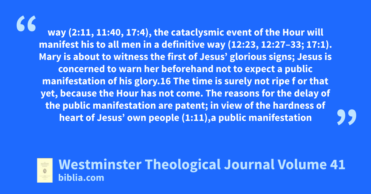 way (2:11, 11:40, 17:4), the cataclysmic event of the Hour will manifest his to all men in a definitive way (12:23, 12:27–33; 17:1). Mary is about to witness the first of Jesus’ glorious signs; Jesus is concerned to warn her beforehand not to expect a public manifestation of his glory.16 The time is surely not ripe f or that yet, because the Hour has not come. The reasons for the delay of the public manifestation are patent; in view of the hardness of heart of Jesus’ own people (1:11),a public manifestation