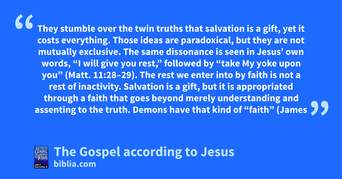 They stumble over the twin truths that salvation is a gift, yet it costs everything. Those ideas are paradoxical, but they are not mutually exclusive. The same dissonance is seen in Jesus’ own words, “I will give you rest,” followed by “take My yoke upon you” (Matt. 11:28–29). The rest we enter into by faith is not a rest of inactivity. Salvation is a gift, but it is appropriated through a faith that goes beyond merely understanding and assenting to the truth. Demons have that kind of “faith” (James