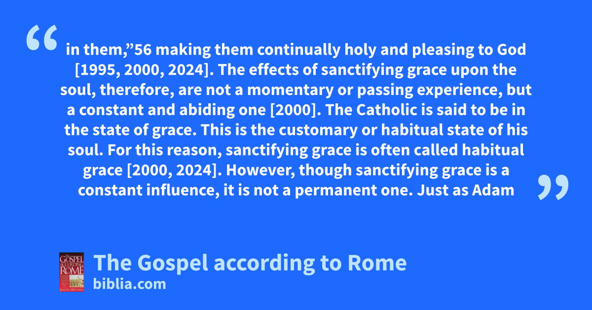 in them,”56 making them continually holy and pleasing to God [1995, 2000, 2024]. The effects of sanctifying grace upon the soul, therefore, are not a momentary or passing experience, but a constant and abiding one [2000]. The Catholic is said to be in the state of grace. This is the customary or habitual state of his soul. For this reason, sanctifying grace is often called habitual grace [2000, 2024]. However, though sanctifying grace is a constant influence, it is not a permanent one. Just as Adam