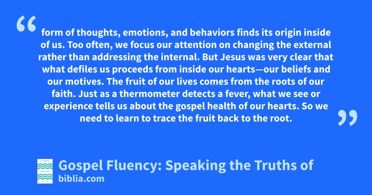 form of thoughts, emotions, and behaviors finds its origin inside of us. Too often, we focus our attention on changing the external rather than addressing the internal. But Jesus was very clear that what defiles us proceeds from inside our hearts—our beliefs and our motives. The fruit of our lives comes from the roots of our faith. Just as a thermometer detects a fever, what we see or experience tells us about the gospel health of our hearts. So we need to learn to trace the fruit back to the root.