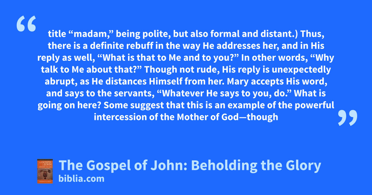 title “madam,” being polite, but also formal and distant.) Thus, there is a definite rebuff in the way He addresses her, and in His reply as well, “What is that to Me and to you?” In other words, “Why talk to Me about that?” Though not rude, His reply is unexpectedly abrupt, as He distances Himself from her. Mary accepts His word, and says to the servants, “Whatever He says to you, do.” What is going on here? Some suggest that this is an example of the powerful intercession of the Mother of God—though