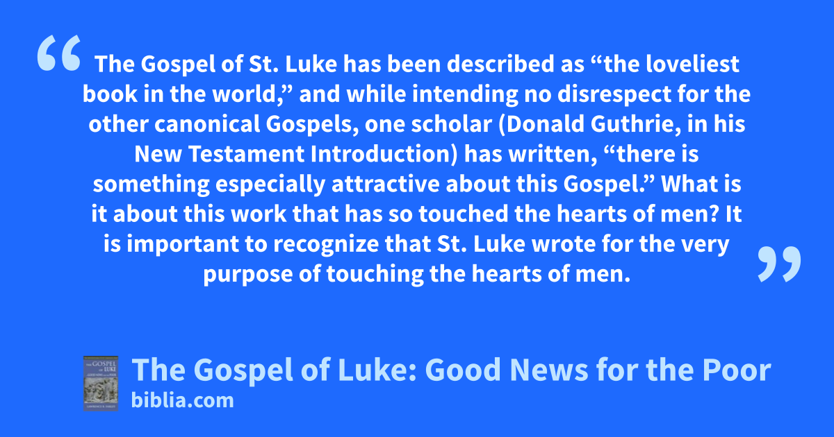The Gospel of St. Luke has been described as “the loveliest book in the world,” and while intending no disrespect for the other canonical Gospels, one scholar (Donald Guthrie, in his New Testament Introduction) has written, “there is something especially attractive about this Gospel.” What is it about this work that has so touched the hearts of men? It is important to recognize that St. Luke wrote for the very purpose of touching the hearts of men.