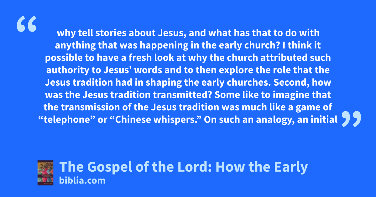 why tell stories about Jesus, and what has that to do with anything that was happening in the early church? I think it possible to have a fresh look at why the church attributed such authority to Jesus’ words and to then explore the role that the Jesus tradition had in shaping the early churches. Second, how was the Jesus tradition transmitted? Some like to imagine that the transmission of the Jesus tradition was much like a game of “telephone” or “Chinese whispers.” On such an analogy, an initial