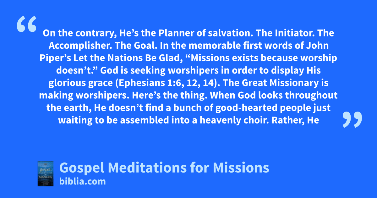 On the contrary, He’s the Planner of salvation. The Initiator. The Accomplisher. The Goal. In the memorable first words of John Piper’s Let the Nations Be Glad, “Missions exists because worship doesn’t.” God is seeking worshipers in order to display His glorious grace (Ephesians 1:6, 12, 14). The Great Missionary is making worshipers. Here’s the thing. When God looks throughout the earth, He doesn’t find a bunch of good-hearted people just waiting to be assembled into a heavenly choir. Rather, He