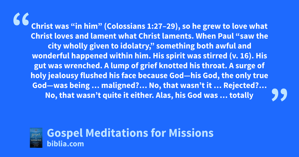Christ was “in him” (Colossians 1:27–29), so he grew to love what Christ loves and lament what Christ laments. When Paul “saw the city wholly given to idolatry,” something both awful and wonderful happened within him. His spirit was stirred (v. 16). His gut was wrenched. A lump of grief knotted his throat. A surge of holy jealousy flushed his face because God—his God, the only true God—was being … maligned?… No, that wasn’t it … Rejected?… No, that wasn’t quite it either. Alas, his God was … totally