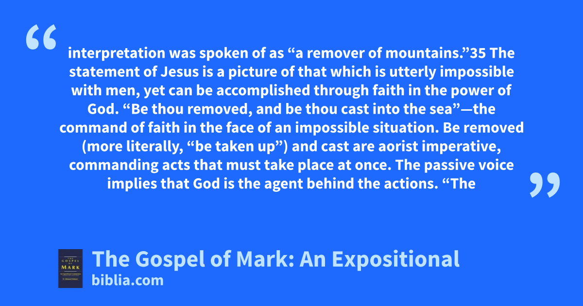interpretation was spoken of as “a remover of mountains.”35 The statement of Jesus is a picture of that which is utterly impossible with men, yet can be accomplished through faith in the power of God. “Be thou removed, and be thou cast into the sea”—the command of faith in the face of an impossible situation. Be removed (more literally, “be taken up”) and cast are aorist imperative, commanding acts that must take place at once. The passive voice implies that God is the agent behind the actions. “The