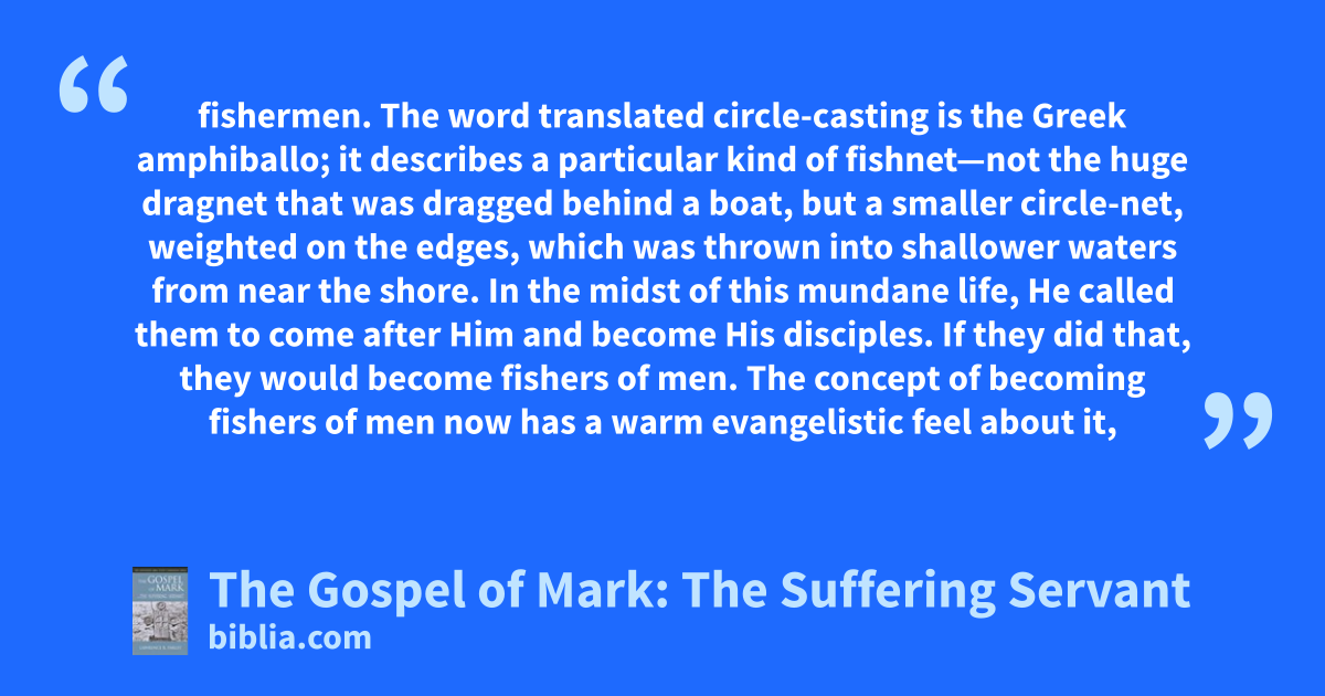 fishermen. The word translated circle-casting is the Greek amphiballo; it describes a particular kind of fishnet—not the huge dragnet that was dragged behind a boat, but a smaller circle-net, weighted on the edges, which was thrown into shallower waters from near the shore. In the midst of this mundane life, He called them to come after Him and become His disciples. If they did that, they would become fishers of men. The concept of becoming fishers of men now has a warm evangelistic feel about it,