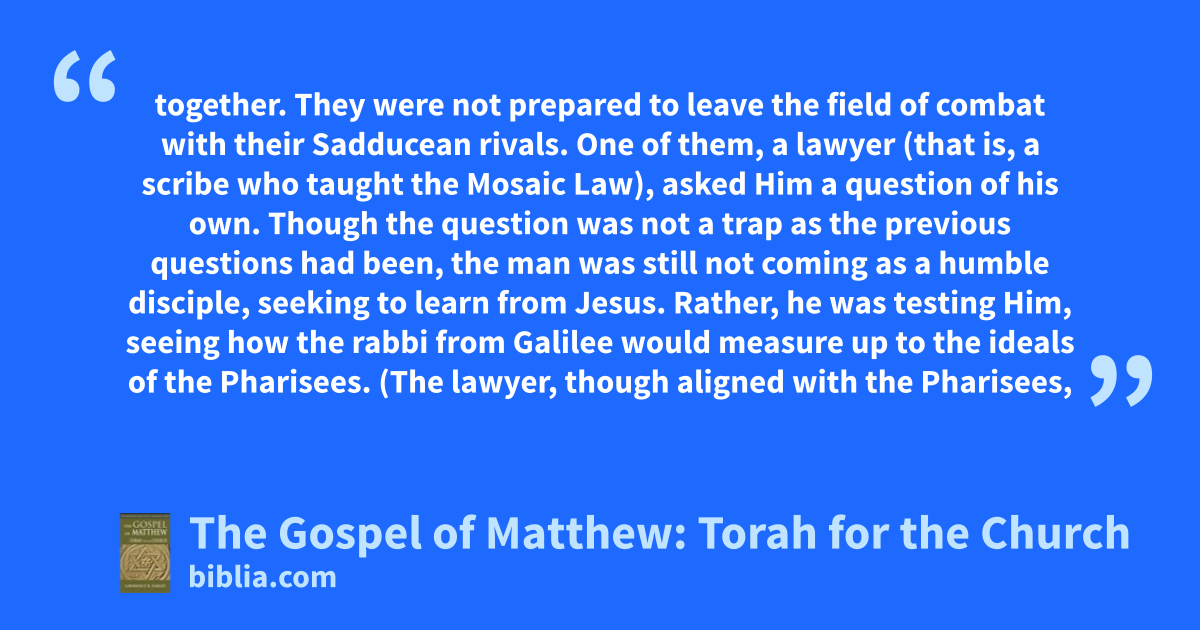 together. They were not prepared to leave the field of combat with their Sadducean rivals. One of them, a lawyer (that is, a scribe who taught the Mosaic Law), asked Him a question of his own. Though the question was not a trap as the previous questions had been, the man was still not coming as a humble disciple, seeking to learn from Jesus. Rather, he was testing Him, seeing how the rabbi from Galilee would measure up to the ideals of the Pharisees. (The lawyer, though aligned with the Pharisees,