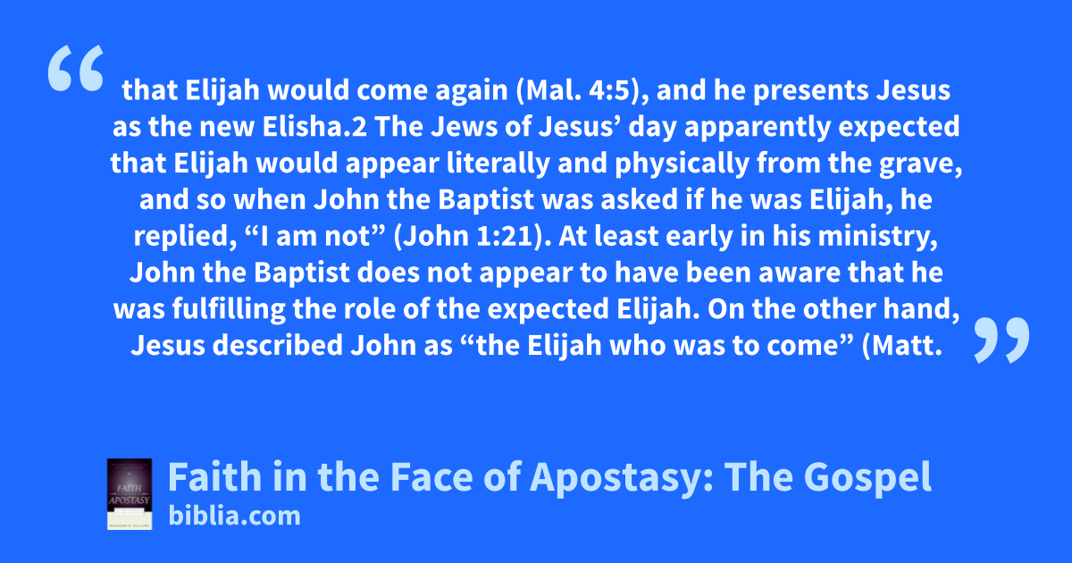 that Elijah would come again (Mal. 4:5), and he presents Jesus as the new Elisha.2 The Jews of Jesus’ day apparently expected that Elijah would appear literally and physically from the grave, and so when John the Baptist was asked if he was Elijah, he replied, “I am not” (John 1:21). At least early in his ministry, John the Baptist does not appear to have been aware that he was fulfilling the role of the expected Elijah. On the other hand, Jesus described John as “the Elijah who was to come” (Matt.