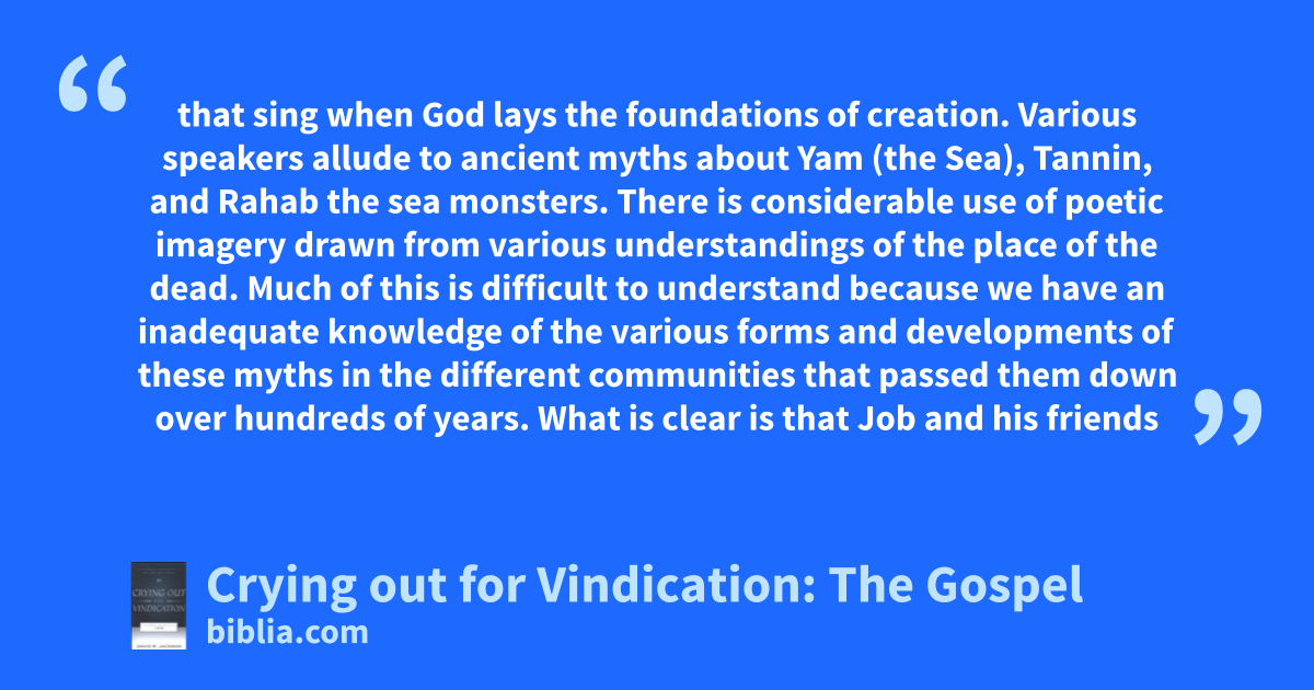 that sing when God lays the foundations of creation. Various speakers allude to ancient myths about Yam (the Sea), Tannin, and Rahab the sea monsters. There is considerable use of poetic imagery drawn from various understandings of the place of the dead. Much of this is difficult to understand because we have an inadequate knowledge of the various forms and developments of these myths in the different communities that passed them down over hundreds of years. What is clear is that Job and his friends