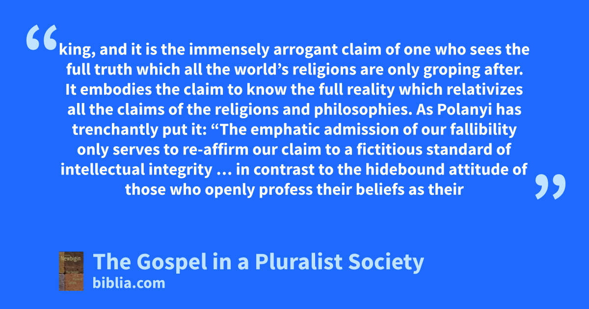 king, and it is the immensely arrogant claim of one who sees the full truth which all the world’s religions are only groping after. It embodies the claim to know the full reality which relativizes all the claims of the religions and philosophies. As Polanyi has trenchantly put it: “The emphatic admission of our fallibility only serves to re-affirm our claim to a fictitious standard of intellectual integrity … in contrast to the hidebound attitude of those who openly profess their beliefs as their