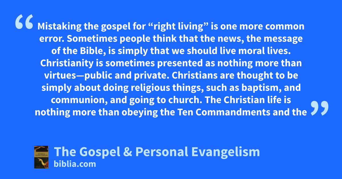 Mistaking the gospel for “right living” is one more common error. Sometimes people think that the news, the message of the Bible, is simply that we should live moral lives. Christianity is sometimes presented as nothing more than virtues—public and private. Christians are thought to be simply about doing religious things, such as baptism, and communion, and going to church. The Christian life is nothing more than obeying the Ten Commandments and the