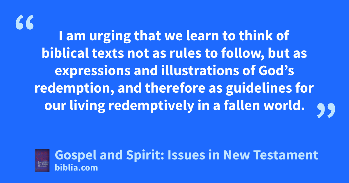 I am urging that we learn to think of biblical texts not as rules to follow, but as expressions and illustrations of God’s redemption, and therefore as guidelines for our living redemptively in a fallen world.