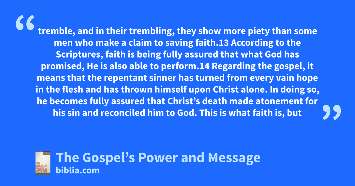 tremble, and in their trembling, they show more piety than some men who make a claim to saving faith.13 According to the Scriptures, faith is being fully assured that what God has promised, He is also able to perform.14 Regarding the gospel, it means that the repentant sinner has turned from every vain hope in the flesh and has thrown himself upon Christ alone. In doing so, he becomes fully assured that Christ’s death made atonement for his sin and reconciled him to God. This is what faith is, but