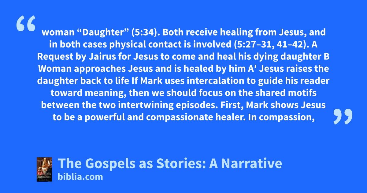 woman “Daughter” (5:34). Both receive healing from Jesus, and in both cases physical contact is involved (5:27–31, 41–42). A Request by Jairus for Jesus to come and heal his dying daughter B Woman approaches Jesus and is healed by him A′ Jesus raises the daughter back to life If Mark uses intercalation to guide his reader toward meaning, then we should focus on the shared motifs between the two intertwining episodes. First, Mark shows Jesus to be a powerful and compassionate healer. In compassion,