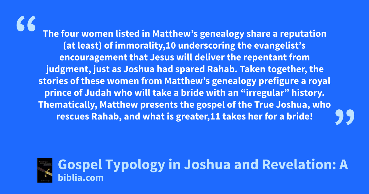 The four women listed in Matthew’s genealogy share a reputation (at least) of immorality,10 underscoring the evangelist’s encouragement that Jesus will deliver the repentant from judgment, just as Joshua had spared Rahab. Taken together, the stories of these women from Matthew’s genealogy prefigure a royal prince of Judah who will take a bride with an “irregular” history. Thematically, Matthew presents the gospel of the True Joshua, who rescues Rahab, and what is greater,11 takes her for a bride!