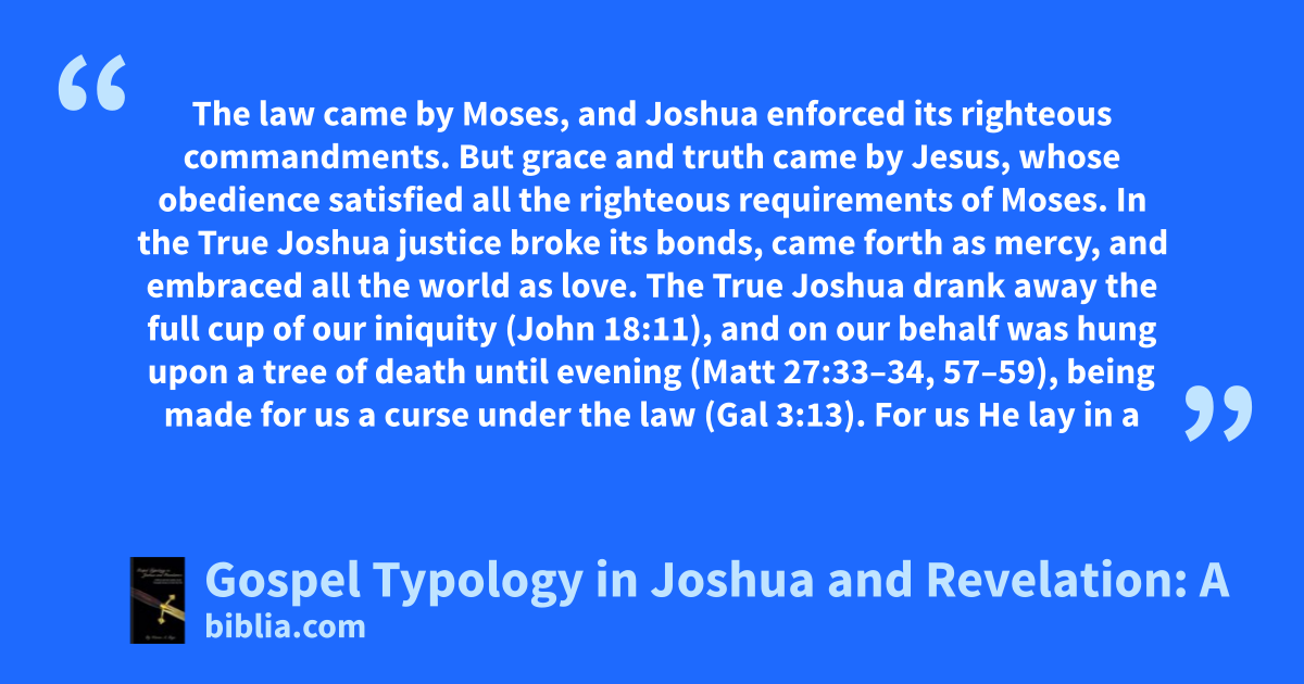 The law came by Moses, and Joshua enforced its righteous commandments. But grace and truth came by Jesus, whose obedience satisfied all the righteous requirements of Moses. In the True Joshua justice broke its bonds, came forth as mercy, and embraced all the world as love. The True Joshua drank away the full cup of our iniquity (John 18:11), and on our behalf was hung upon a tree of death until evening (Matt 27:33–34, 57–59), being made for us a curse under the law (Gal 3:13). For us He lay in a