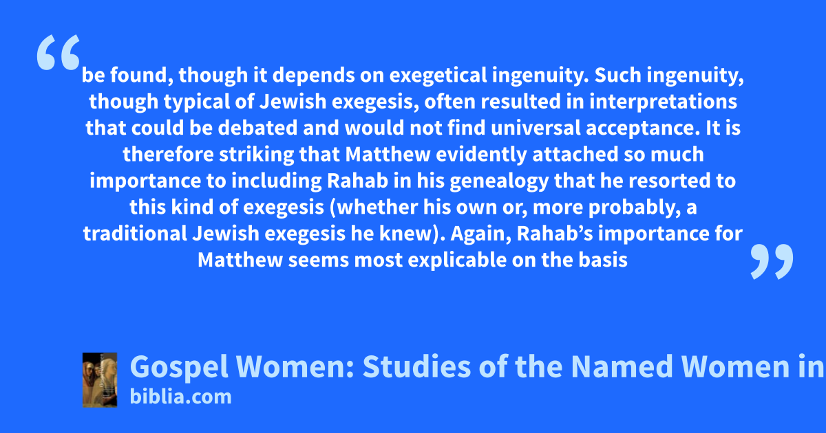 be found, though it depends on exegetical ingenuity. Such ingenuity, though typical of Jewish exegesis, often resulted in interpretations that could be debated and would not find universal acceptance. It is therefore striking that Matthew evidently attached so much importance to including Rahab in his genealogy that he resorted to this kind of exegesis (whether his own or, more probably, a traditional Jewish exegesis he knew). Again, Rahab’s importance for Matthew seems most explicable on the basis