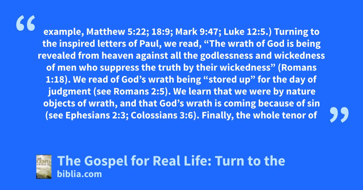 example, Matthew 5:22; 18:9; Mark 9:47; Luke 12:5.) Turning to the inspired letters of Paul, we read, “The wrath of God is being revealed from heaven against all the godlessness and wickedness of men who suppress the truth by their wickedness” (Romans 1:18). We read of God’s wrath being “stored up” for the day of judgment (see Romans 2:5). We learn that we were by nature objects of wrath, and that God’s wrath is coming because of sin (see Ephesians 2:3; Colossians 3:6). Finally, the whole tenor of