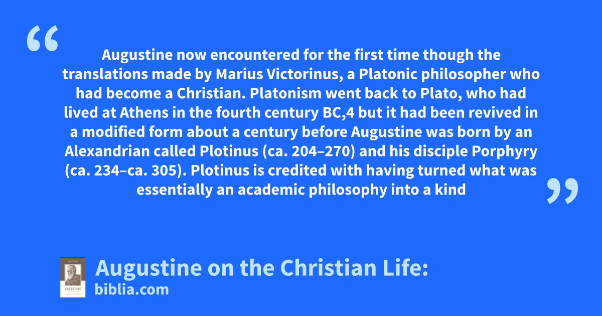 Augustine now encountered for the first time though the translations made by Marius Victorinus, a Platonic philosopher who had become a Christian. Platonism went back to Plato, who had lived at Athens in the fourth century BC,4 but it had been revived in a modified form about a century before Augustine was born by an Alexandrian called Plotinus (ca. 204–270) and his disciple Porphyry (ca. 234–ca. 305). Plotinus is credited with having turned what was essentially an academic philosophy into a kind