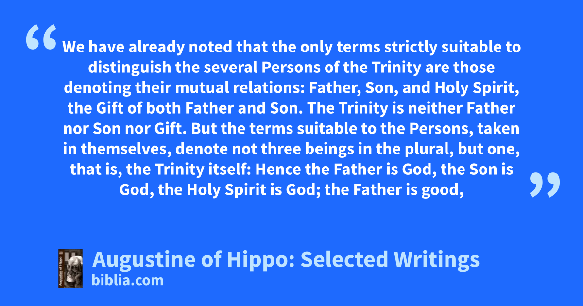 We have already noted that the only terms strictly suitable to distinguish the several Persons of the Trinity are those denoting their mutual relations: Father, Son, and Holy Spirit, the Gift of both Father and Son. The Trinity is neither Father nor Son nor Gift. But the terms suitable to the Persons, taken in themselves, denote not three beings in the plural, but one, that is, the Trinity itself: Hence the Father is God, the Son is God, the Holy Spirit is God; the Father is good,