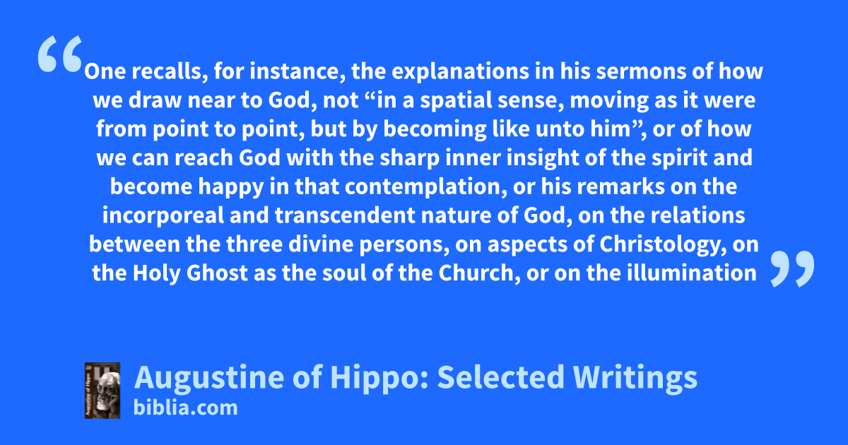 One recalls, for instance, the explanations in his sermons of how we draw near to God, not “in a spatial sense, moving as it were from point to point, but by becoming like unto him”, or of how we can reach God with the sharp inner insight of the spirit and become happy in that contemplation, or his remarks on the incorporeal and transcendent nature of God, on the relations between the three divine persons, on aspects of Christology, on the Holy Ghost as the soul of the Church, or on the illumination