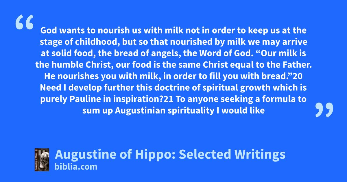 God wants to nourish us with milk not in order to keep us at the stage of childhood, but so that nourished by milk we may arrive at solid food, the bread of angels, the Word of God. “Our milk is the humble Christ, our food is the same Christ equal to the Father. He nourishes you with milk, in order to fill you with bread.”20 Need I develop further this doctrine of spiritual growth which is purely Pauline in inspiration?21 To anyone seeking a formula to sum up Augustinian spirituality I would like